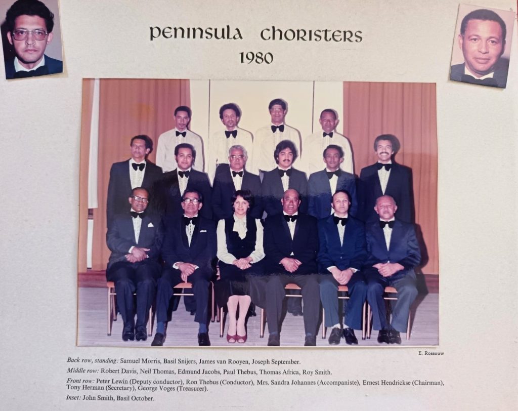 Peninsula Choristers circa 1980Peninsula Choristers 1980Gus & Tony Herman performing ViolettaElaine Green & Tony Herman at rehearsalTony Herman dancing with Yvonne Laboudeuse & in background, Alida Lewin at the Annual Choristers Party (or Bust-up, as they used to call it)Annual Choristers Party attended by May AbrahamseHoly Redeemer Catholic Church ChoirHoly Redeemer Catholic Church Choir)Folk Liturgy Group, Holy Redeemer ChurchMembers of Immaculata Ladies ChoirMarjorie Goosen, conductress of Immaculata choir, and her Husband GeorgeSt Anthony’s Primary School in HeathfieldCape Welsh ChoirChantal and Tony Herman attending a Cape Welsh Choir event