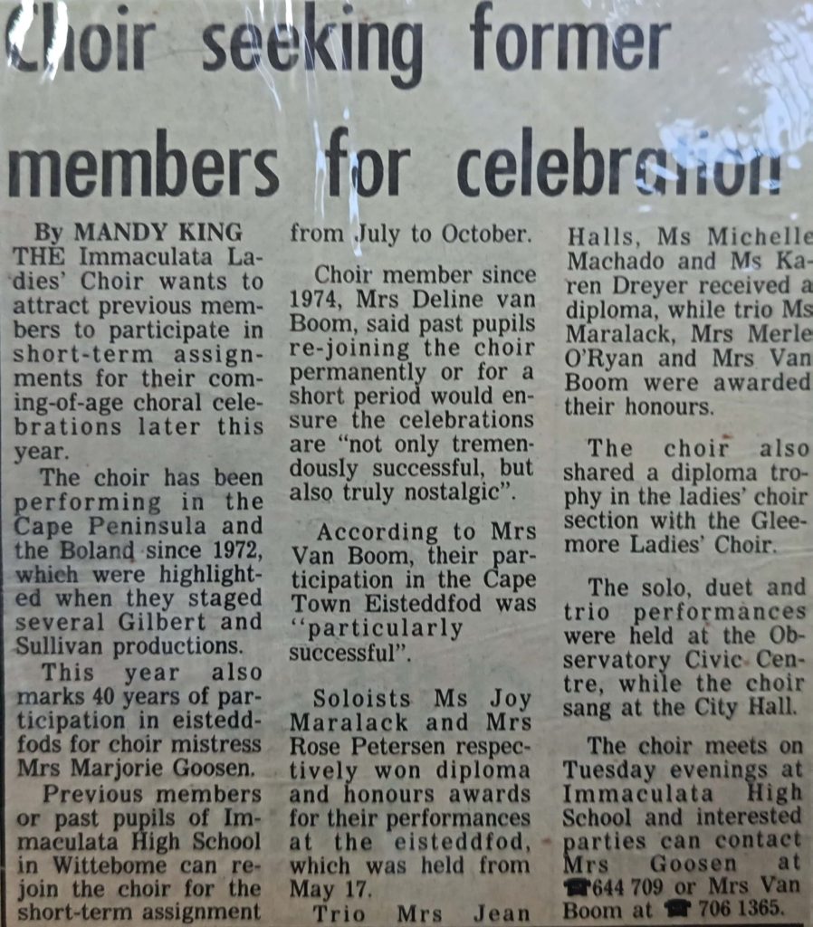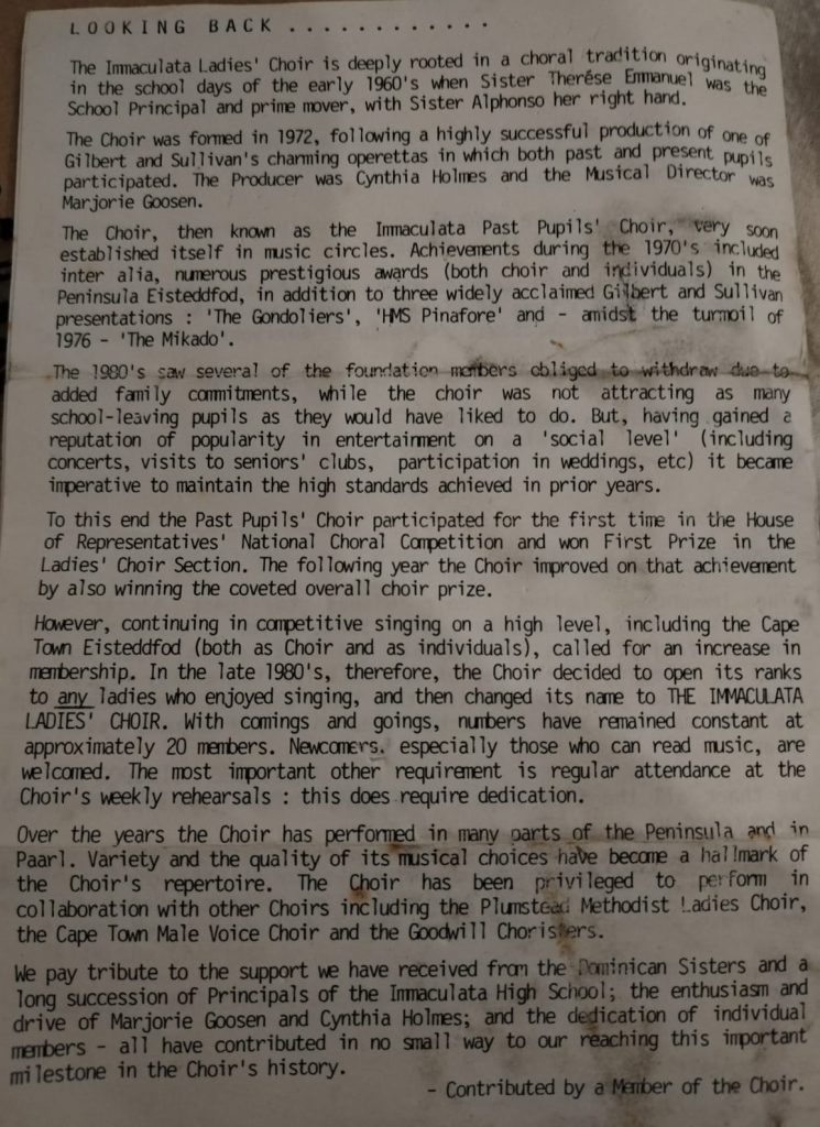 Consisted mostly of past pupils who met to practice at Immaculata Senior School Hall in Wittebome, in the evening.