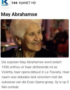 Since her brilliant opera debut in 1956 as Violetta, in the first local production of La Traviata at the Cape Town City Hall, soprano May Abrahamse has been a legend. Born in Cape Town’s District Six, May started singing with the Eoan junior choir at the age of 14. The name May Abrahamse has for decades been synonymous with the successes of the Eoan Opera Group as one of their greatest stars, in performances like La Bohéme and Madama Butterfly. May was, however, only allowed to perform on the Nico Malan (now Artscape) opera stage in 1979. As the longest serving principal soprano for the Eoan Group, May received a Kanna Award from the Klein Karoo National Arts Festival, as well as a kykNET Fiësta Award in 2013, for her lifelong contribution to the arts. This documentary is part of a kykNET-series, Formidabele Vroue.
